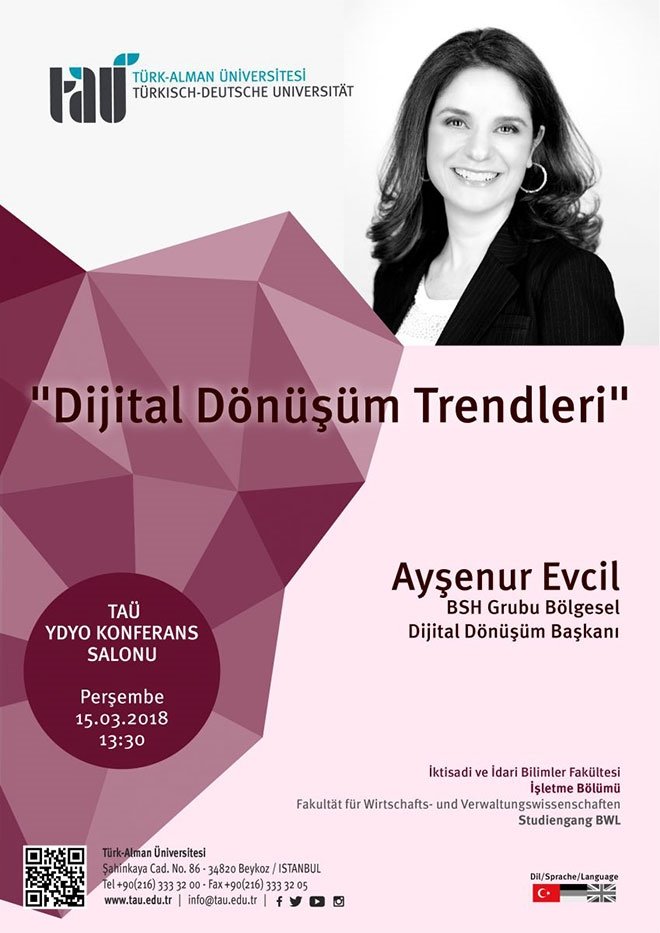 Türk-Alman Üniversitesi İşletme Bölümü tarafından organize edilen "Dijital Dönüşüm Trendleri" semineri, 15.03.2018 Perşembe günü saat 13:00'da, Üniversitenin Yabancı Diller Konferans Salonu'nda gerçekleşecektir.
