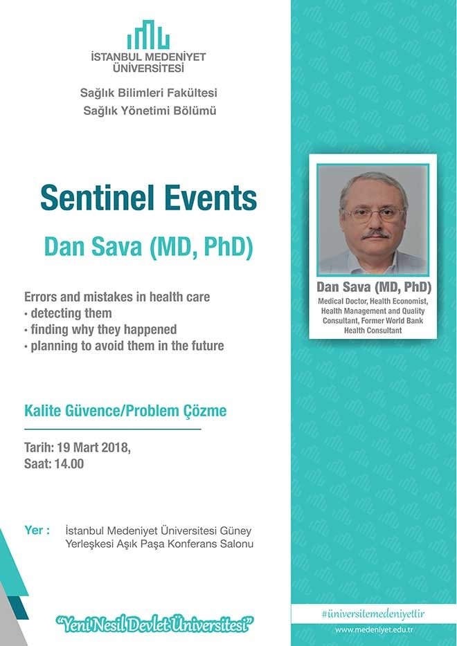Sağlık Bilimleri Fakültemiz Sağlık Yönetimi Bölümü tarafından 19.03.2017 tarihinde saat 14.00'de Güney Yerleşkesi Aşık Paşa Konferans Salonu'nda Dan Sava (MD, PhD) (Tıp Doktoru, Sağlık Ekonomisi Doktoru, Sağlık Yönetimi ve Kalite Danışmanı, Eski Dünya Bankası Danışmanı) tarafından Kalite Güvence/Problem Çözme kapsamında "Sentinel Events" başlıklı seminer gerçekleştirilecektir.