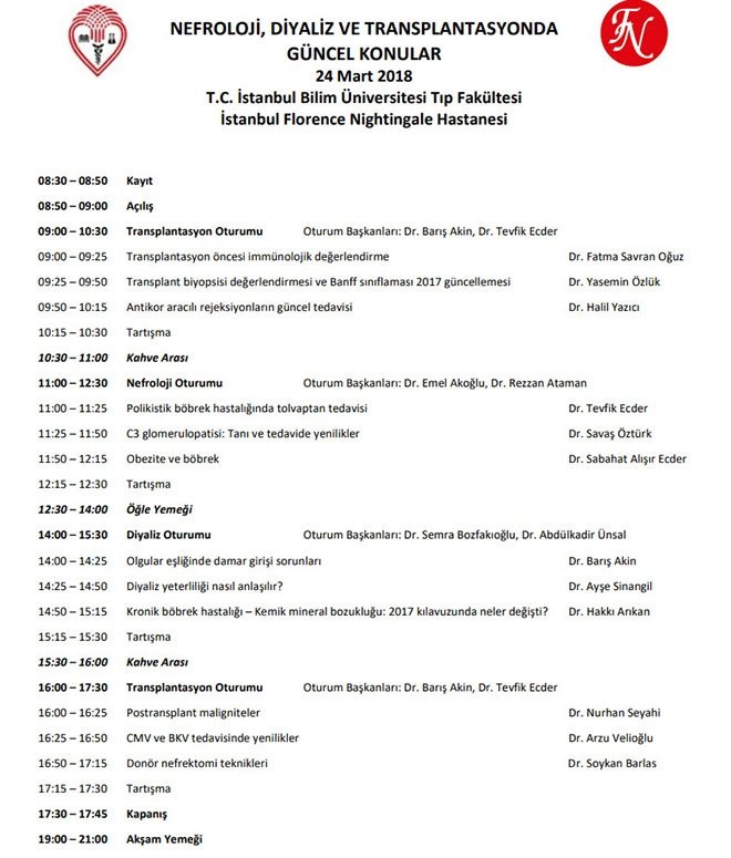 24 Mart 2018 Pazar günü, saat 08:30'dan 21:00'a kadar sürecek olan, Nefroloji, Diyaliz ve Transplantasyonda Güncel Konular etkinliği İstanbul Florence Nightingale Hastanesi Konferans Salonu 1. katta gerçekleşecek olup, etkinlik 4 oturumdan oluşacak.