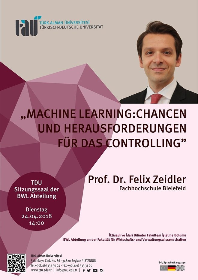 İşletme Bölümü tarafından düzenlenen "Machine Learning: Chancen und Herausforderungen für das Controlling" konulu etkinlik, 24.04.2018 Salı günü saat 14:00'da İİBF Toplantı Salonunda gerçekleşecektir. (Konferansın dili Almanca)