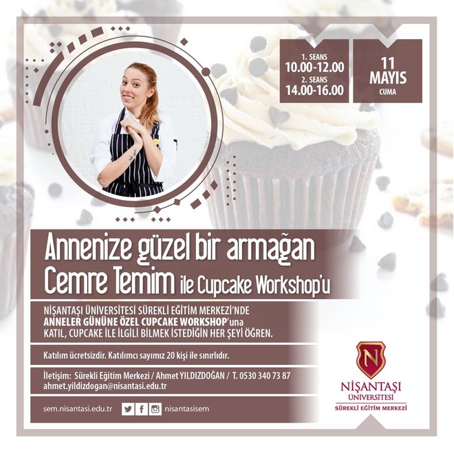 Evrensel bir gün olan ancak tarihi ülkelere göre farklılaşan Anneler Günü için hazırlıklar devam ederken, Nişantaşı Üniversitesi Sürekli Eğitim Merkezi Anneler Gününe özel olarak Cemre Tenim ile Cupcake Workshop’u yapacak.