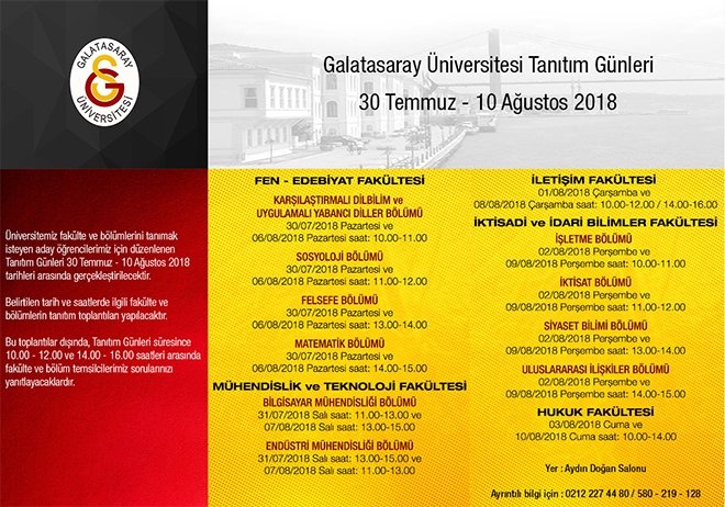 Galatasaray Üniversitesi,öğrencilerin meslek alanlarını tanıyarak yapabilmelerine olanak sağlamak amacıyla "Tanıtım Günleri" düzenliyor. 30 Temmuz - 10 Ağustos 'ta düzenlenecek "Tanıtım Günleri"nde, üniversite adaylarına tercihlerine yönelik tanıtım yapılacak.