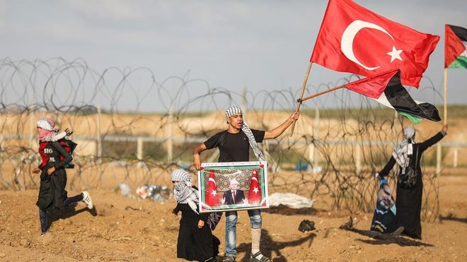 Gazze İsrail sınırında bir grup Filistinli, ellerinde Cumhurbaşkanı Recep Tayyip Erdoğan'ın fotoğrafını ve Türk bayrağını taşıdı.