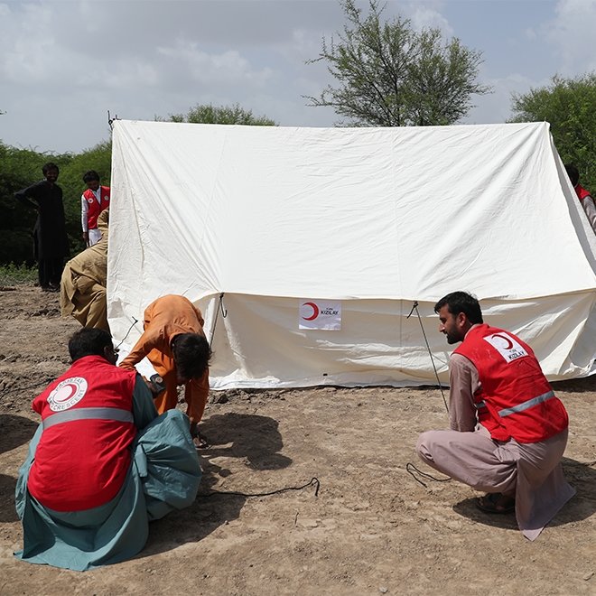 Pakistan Kızılayı iş birliği ile gıda kolisi, hijyen kiti, yatak, battaniye, su bidonu, giysi, ikramlık ve oyuncak yardımlarını sürdüren Kızılay, sel bölgelerine sevk ettiği 500 adet 12 metrekare afet çadırının kurulumuna bir taraftan devam ederken diğer taraftan kurulumu tamamlanan çadırlara selden etkilenen insanları yerleştirmeye başladı.