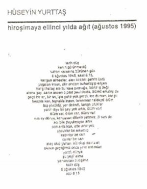 Hüseyin Yurttaş ise Hiroşima'ya atılan atom bombasını "Hiroşima'ya Ellinci Yılda Ağıt" adlı şiirle görselleştirir. Şiirin, başladığı gibi "6 Ağustos 1945, saat 8.15"le bitmesi bombanın düşüş noktasına denk gelir; şair sözcükler aracılığıyla zamanı tam o anda durdurur