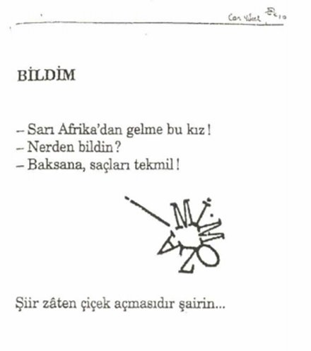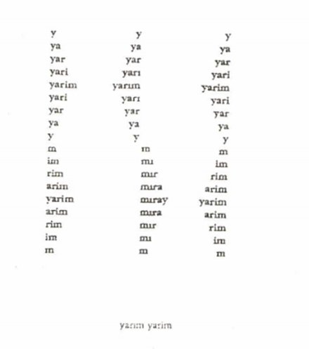 "Bu akım içinde görülebilecek hemen hemen bütün metinlerim, tek harf, tek hece, tek sözcük kullanılarak yapılanmıştır. Bunu aşanlar, ancak somut şiir ile geleneksel anlayış şiirleri diyebileceğim m etinler arasında bir köprü oluşturur."