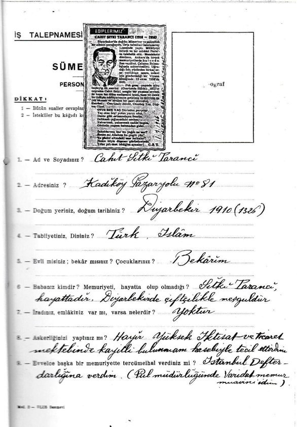 Usta şair Cahit Sıtkı Tarancı'nın Beykoz Kundura Fabrikası'na yaptığı iş başvurusunun belgesi yapılan araştırmalar sonucu bulundu. Cahit Sıtkı Tarancı'ya ait iş başvuru belgesinde, şairin el yazısıyla yanıtladığı adres, memleket, doğum tarihi, askerlik durumu gibi sorular yer alıyor. "İstediğiniz maaş nedir?" sorusuna usta şairin verdiği cevap ise dikkat çekiyor: "Ne layık görülürse".