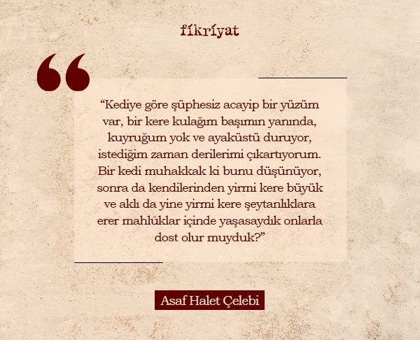"Aç kediye çörek attım. Öyle hırsla baktı ve yedi ki: Başka var mı diye döndü ve olmadığını görünce gözleriyle teşekkür etmeyi bildi. Bununla beraber insan değildi, kediydi. Yeni aldığım kitapla diyorlar ki ilk memeli hayvanlar yirmi kere daha aptalmış. Şu halde kedi ileride insandan akıllı olacak demek."