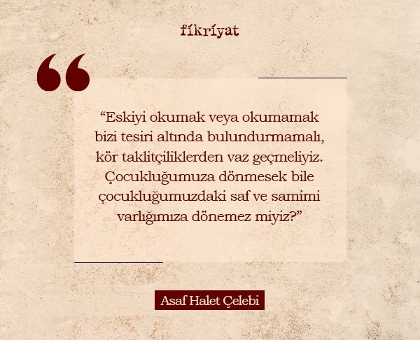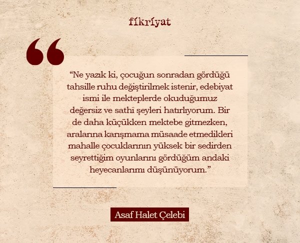 "Ne yazık ki, çocuğun sonradan gördüğü tahsille ruhu değiştirilmek istenir, edebiyat ismi ile mekteplerde okuduğumuz değersiz ve sathî şeyleri hatırlıyorum. Bir de daha küçükken mektebe gitmezken, aralarına karışmama müsaade etmedikleri mahalle çocuklarının yüksek bir sedirden seyrettiğim oyunlarını gördüğüm andaki heyecanlarımı düşünüyorum. Onlarda, bu zeki İstanbul çocuklarında ne sevimli, ne cazip bir istihza vardı. Kahkahaları ne kadar çalâk ve cazibdi, görüşleri ne kadar yumuşaktı, eğlenceleri ne saf ve samimiydi. Bu çocuklar, şimdi, kim bilir nasıl birer insan oldular. Acaba içlerinden şairler olmasa bile özene bezene yazı yazanlar oldu mu? Fakat kim bilir bunlar eski samimî zevklerinde ne kadar aykırı şeyler yazdılar ve söylediler, edebî zevkleri öldüren mektep hocaları kim bilir onların ruhlarını ne kadar hırpaladılar. Güzel, doğru, müspet diye gösterdikleri şeyler kim bilir ne kadar ısınıp ısınıp konmuş, yabancılıktan, ne pestenkeranî romantizm kırıntılarından ibaretti?"
