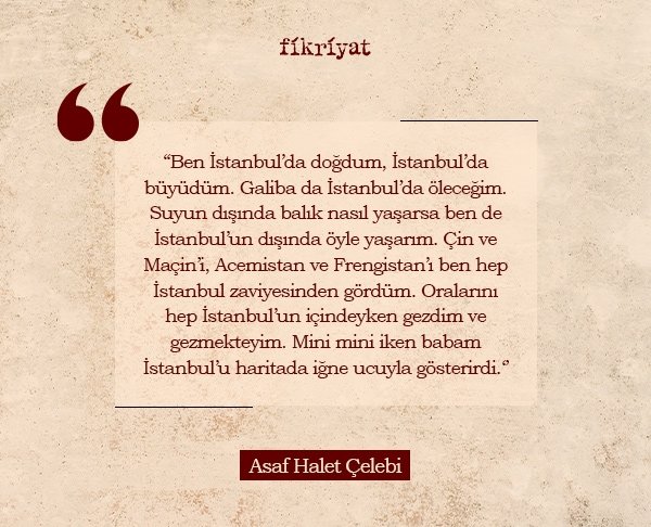 "Ben İstanbul'da doğdum, İstanbul'da büyüdüm. Galiba da İstanbul'da öleceğim. Suyun dışında balık nasıl yaşarsa ben de İstanbul'un dışında öyle yaşarım. Çin ve Maçin'i, Acemistan ve Frengistan'ı ben hep İstanbul zaviyesinden gördüm. Oralarını hep İstanbul'un içindeyken gezdim ve gezmekteyim. Mini mini iken babam İstanbul'u haritada iğne ucuyla gösterirdi. Bu vaziyette onu hap gibi yutsam, yuttuğumun farkına varmazdım. İstanbul'la ben can ve gövde gibiyiz. Bazan benim bazan onun rollerimiz değişir. İstanbul olmasa ben olmazdım ama, bana öyle geliyor ki ben olmasam belki İstanbul'da olmayacaktı. "
