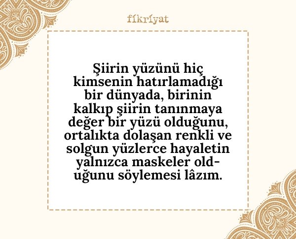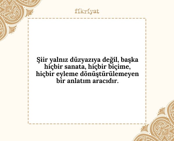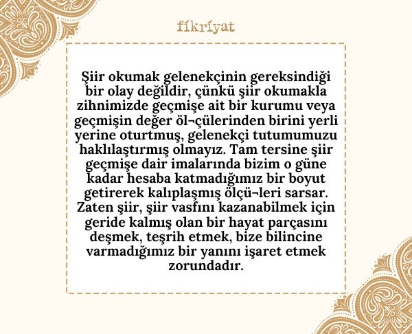 Şiir okumak gelenekçinin gereksindiği bir olay değildir, çünkü şiir okumakla zihnimizde geçmişe ait bir kurumu veya geçmişin değer ölçülerinden birini yerli yerine oturtmuş, gelenekçi tutumumuzu haklılaştırmış olmayız. Tam tersine şiir geçmişe dair imalarında bizim o güne kadar hesaba katmadığımız bir boyut getirerek kalıplaşmış ölçüleri sarsar. Zaten şiir, şiir vasfını kazanabilmek için geride kalmış olan bir hayat parçasını deşmek, teşrih etmek, bize bilincine varmadığımız bir yanını işaret etmek zorundadır.