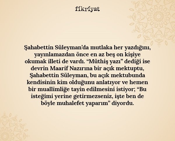 Şahabettin Süleyman'da mutlaka her yazdığını, yayınlamazdan önce en az beş on kişiye okumak illeti de vardı. "Müthiş yazı" dediği ise devrin Maarif Nazırına bir açık mektuptu, Şahabettin Süleyman, bu açık mektubunda kendisinin kim olduğunu anlatıyor ve hemen bir muallimliğe tayin edilmesini istiyor; "Bu isteğimi yerine getirmezseniz, işte ben de böyle muhalefet yaparım" diyordu.
