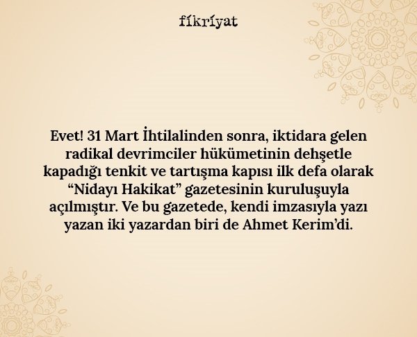 Evet! 31 Mart İhtilalinden sonra, iktidara gelen radikal devrimciler hükümetinin dehşetle kapadığı tenkit ve tartışma kapısı ilk defa olarak "Nidayı Hakikat" gazetesinin kuruluşuyla açılmıştır. Ve bu gazetede, kendi imzasıyla yazı yazan iki yazardan biri de Ahmet Kerim'di.
