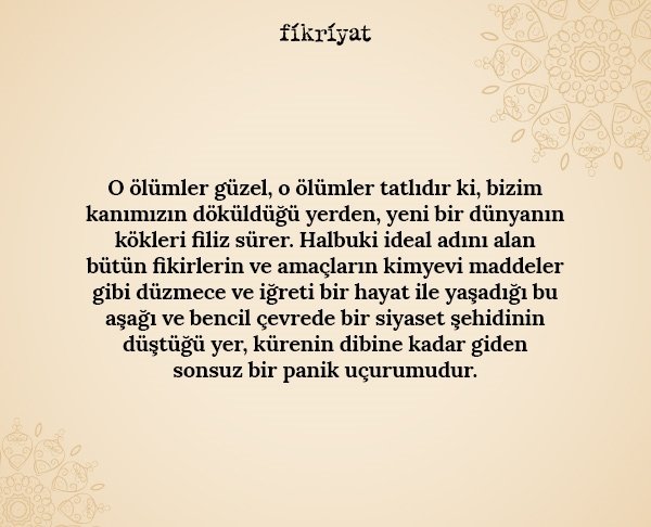 O ölümler güzel, o ölümler tatlıdır ki, bizim kanımızın döküldüğü yerden, yeni bir dünyanın kökleri filiz sürer. Halbuki ideal adını alan bütün fikirlerin ve amaçların kimyevi maddeler gibi düzmece ve iğreti bir hayat ile yaşadığı bu aşağı ve bencil çevrede bir siyaset şehidinin düştüğü yer, kürenin dibine kadar giden sonsuz bir panik uçurumudur.