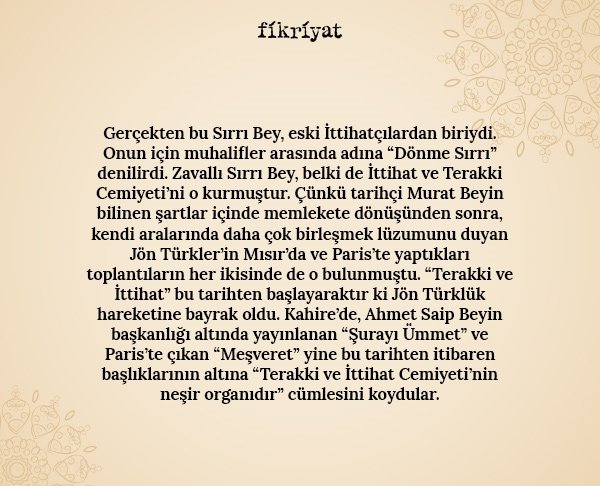 Gerçekten bu Sırrı Bey, eski İttihatçılardan biriydi. Onun için muhalifler arasında adına "Dönme Sırrı" denilirdi. Zavallı Sırrı Bey, belki de İttihat ve Terakki Cemiyeti'ni o kurmuştur. Çünkü tarihçi Murat Beyin bilinen şartlar içinde memlekete dönüşünden sonra, kendi aralarında daha çok birleşmek lüzumunu duyan Jön Türkler'in Mısır'da ve Paris'te yaptıkları toplantıların her ikisinde de o bulunmuştu. "Terakki ve İttihat" bu tarihten başlayaraktır ki Jön Türklük hareketine bayrak oldu. Kahire'de, Ahmet Saip Beyin başkanlığı altında yayınlanan "Şurayı Ümmet" ve Paris'te çıkan "Meşveret" yine bu tarihten itibaren başlıklarının altına "Terakki ve İttihat Cemiyeti'nin neşir organıdır" cümlesini koydular.