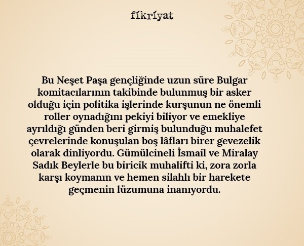 Bu Neşet Paşa gençliğinde uzun süre Bulgar komitacılarının takibinde bulunmuş bir asker olduğu için politika işlerinde kurşunun ne önemli roller oynadığını pekiyi biliyor ve emekliye ayrıldığı günden beri girmiş bulunduğu muhalefet çevrelerinde konuşulan boş lâfları birer gevezelik olarak dinliyordu. Gümülcineli İsmail ve Miralay Sadık Beylerle bu biricik muhalifti ki, zora zorla karşı koymanın ve hemen silahlı bir harekete geçmenin lüzumuna inanıyordu.