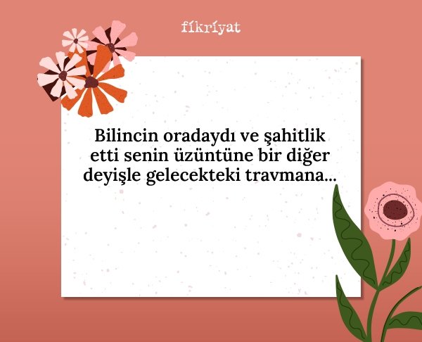 🔹 Biliyorum; sen, seni kötü manada etkileyecek her şeyi 2 yaşında veyahut 3 yaşında veyahut 5 yaşında yaşadın hem de bilincinle ve tüm kavrayışınla. Bilincin oradaydı ve şahitlik etti senin üzüntüne bir diğer deyişle gelecekteki travmana.