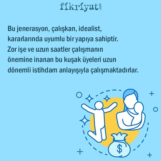 💠 Bu jenerasyon, çalışkan, idealist, kararlarında uyumlu bir yapıya sahiptir. Zor işe ve uzun saatler çalışmanın önemine inanan bu kuşak üyeleri uzun dönemli istihdam anlayışıyla çalışmaktadırlar.