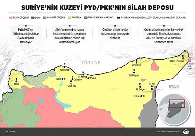 ABD Merkez Kuvvetler Komutanlığı'nın (CENTCOM), terör örgütü DEAŞ'la mücadele gerekçesiyle PYD/PKK'ya verdiği silahlar terör örgütü tarafından işgal bölgelerine göre belirlenmiş 13 ana depoda saklanıyor. Terör örgütü üyelerine silah dağıtımını bu depolar üzerinden gerçekleştiriyor.