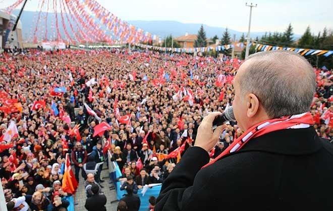 Cerablus'ta, Rai'de, El Bab'da kendisini gösterdi. Burada 950 kilometre karelik alan kontrolümüzde. Buralarda işgale mi gidiyoruz. Tam aksine biz teröristlerden koruyoruz. O toprakların gerçek sahiplerine oraları teslim etmeye gidiyoruz. Cerablus'ta böyle olmadı mı, 140 bin halk döndü, oralarda yaşıyorlar. Afrin'de de topraklarına dönmeye başladılar. Biz merhamet dininin mensuplarıyız. Bu yolda azimle, kararlılıkla yürüdük, yürüyoruz. Bu dinin mensupları olarak bizler, zerre kadar burada tavize yetkimiz yok.