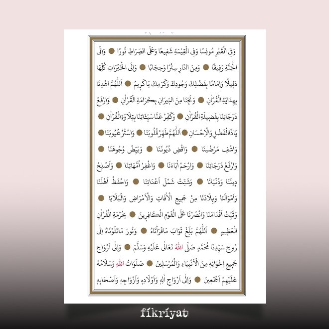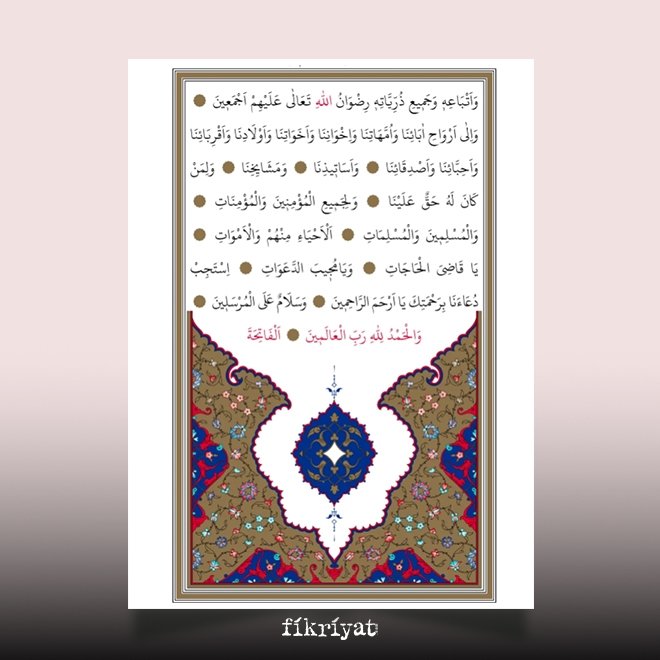 Allah'ım! Okuduğumuz ve tilavet ettiğimiz Kur'ân'ın sevabını ve nurunu Efendimiz Hz. Muhammed (a.s)'in ruhuna ulaştır. Ve onun kardeşleri olan tüm peygamberlerin (a.s) ruhlarına ulaştır. Ve Peygamberimiz (a.s)'in ehlinin, çocuklarının, hanımlarının, ashabının, tabiinin ve bütün zürriyetinin ruhlarına ulaştır.