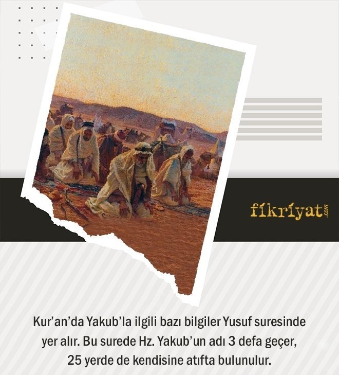 🔸 Hz. Yakub, insanları doğru yola ve Hak dine davet eden peygamberlerdendir; Hz. İbrahim'in torunu ve Yahudi inancına göre İsrailoğulları'nın atası olarak adlandırılan üç kişiden biridir. Diğer ikisi ise Hz. İbrahim ve Hz. İshak'tır.