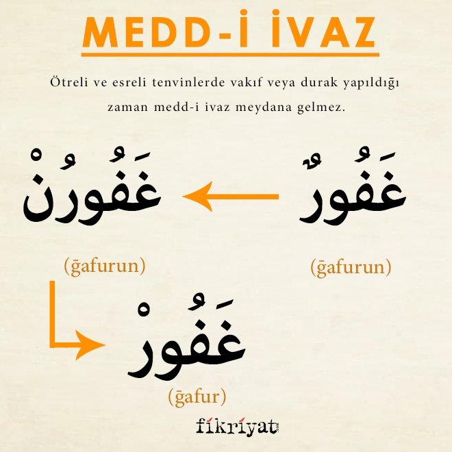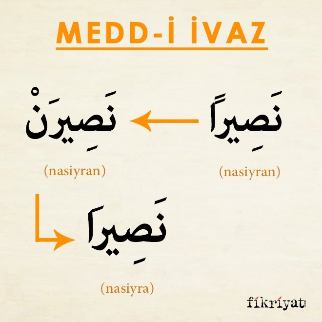 ➡ Medd-i ivaz ile alakalı olarak نَصِيرًا (nasiyran) kelimesi örnek verilebilir. Kelimenin açık halde okunuşu نَصِيرَنْ şeklindedir. Ancak nasiyaran kelimesinde ayet sonu olması veya vakıf yapılması sebebiyle durulursa sonundaki tenvin, üstünlü tenvin olduğu için, nun harfi ortadan kalkar ve ra harfi bir elif miktarı uzatılarak yani medd-i tabi yapılarak durulur. Bu değişime medd-i ivaz adı verilir.