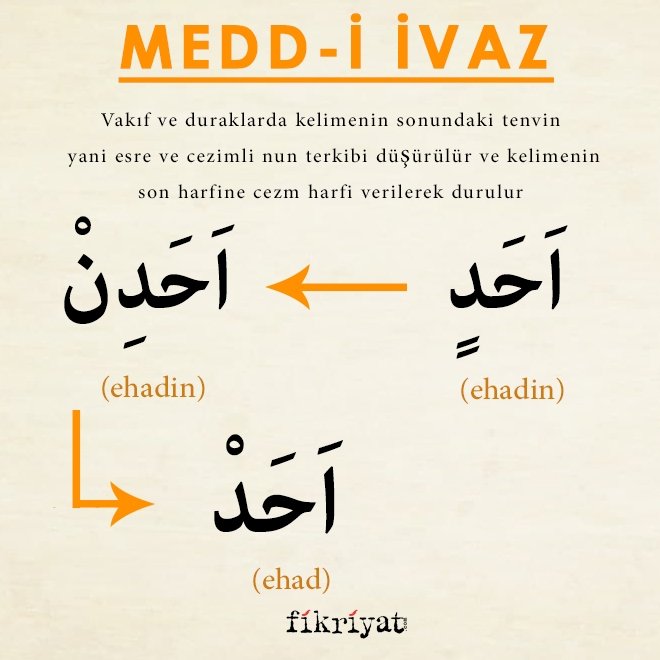 ➡ Örneğin اَحَدٍ (ehadin) kelimesinin açık halde yazılımı اَحَدِنْ şeklindedir. Ancak bu kelime üzerinde durulduğu zaman sakin nun ve esre harfi düşer ve dal harfine sükun yani cezm harekesi verilerek yani اَحَدْ (ehad) şeklinde durulur. Dolayısıyla her hangi bir med yani uzatarak okuma söz konusu olmaz.