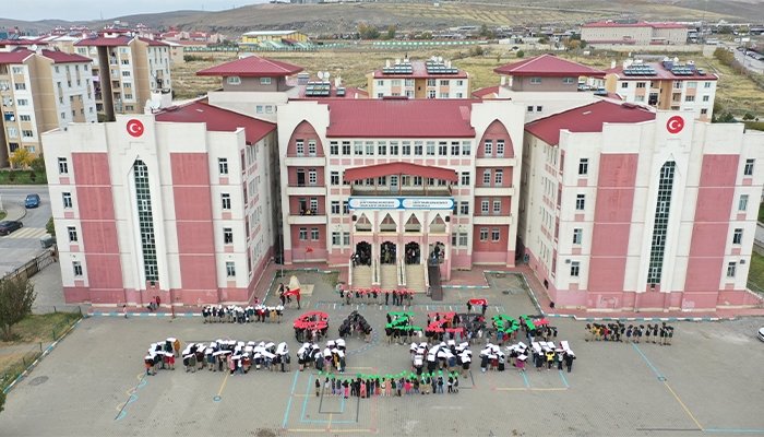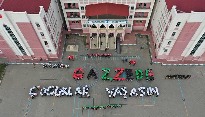 Şehit Ramazan Keserci İmam Hatip Ortaokulu öğrencileri, İsrail ordusunun Gazze Şeridi'ne yönelik saldırılarına tepki göstermek amacıyla okulun bahçesinde bir araya geldi.