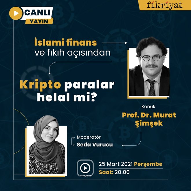 İslam fıkhı alanındaki çalışmalarıyla tanınan, kıymetli yazarımız Karabük Üniversitesi İlahiyat Fakültesi dekanı Prof. Dr. Murat Şimşek, 25 Mart 2021 Perşembe günü 20.00’da canlı yayın konuğumuz olacak. Fikriyat Instagram hesabımız üzerinden gerçekleştirilecek olan yayında, kripto paraların İslami finans ve fıkıh açısından hükmüne, helal olup olmadığı meselesine, blokzincir teknolojisinin İslam dünyasına sağlayabileceği avantajlara değinilecek. Yayınımızı, Fikriyat Instagram hesabından izleyebilir, soru ve görüşlerinizi iletebilirsiniz.
