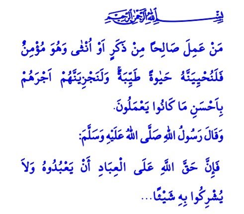 Yüce Kitabımız Kur'an-ı Kerim'de şöyle buyrulur: "Erkek veya kadın, mümin olarak kim iyi amel işlerse, onu mutlaka güzel bir hayat ile yaşatırız. Ve mükâfatlarını, elbette yapmakta olduklarının en güzeli ile veririz."[3]