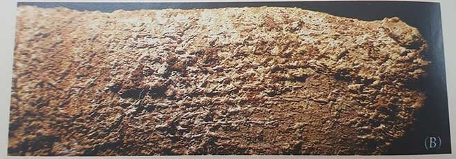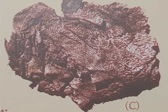 Çatalhöyük: Konya ili, Çumra ilçesinde M.Ö. 6200-6100 tarihlenen Neolitik dönem Çatalhöyük yerleşmesinde, bir tapınakta, bir iskeletin başının altında bulunmuş, olasılıkla küçük bir yastığa ait kumaş parçası. (C)