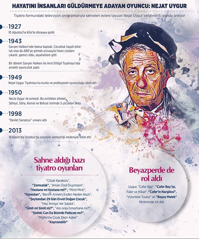 Altmış yılı aşkın bir süre boyunca tiyatroya ailesiyle birlikte hizmet eden ve kendisini insanları güldürmeye adayan Nejat Uygur, Türk temaşa sanatı geleneğinde kendine özgü bir tavır geliştirdi.