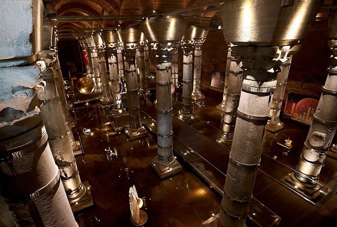 Yaklaşık 100 bin ton su depolama kapasitesine sahip olan Yerebatan Sarnıcı'ndaki sütunların, köşeli veya yivli biçimde olan birkaç tanesi hariç büyük çoğunluğu silindir biçiminde. Sarnıcın kuzeybatı köşesindeki iki sütunun altında kaide olarak kullanılan iki Medusa başı, Roma dönemi heykel sanatının şaheserlerindendir.