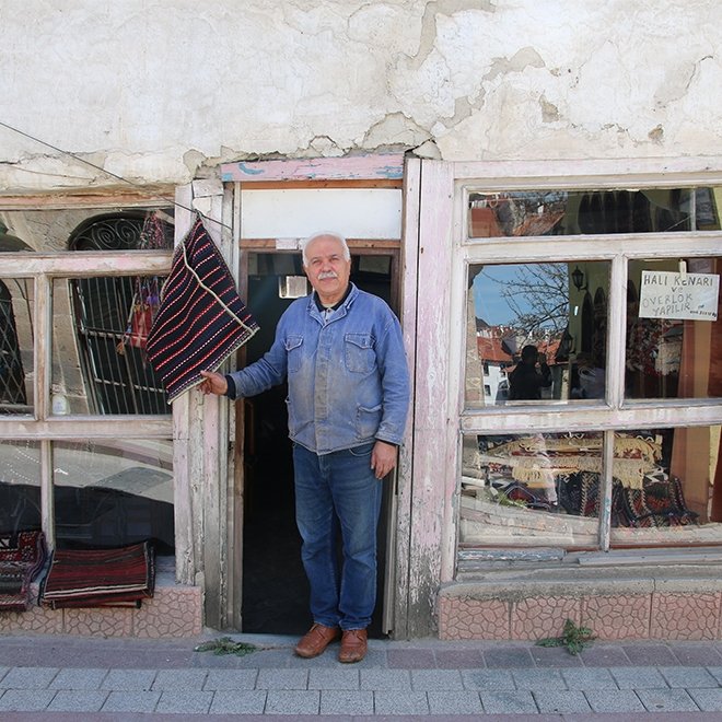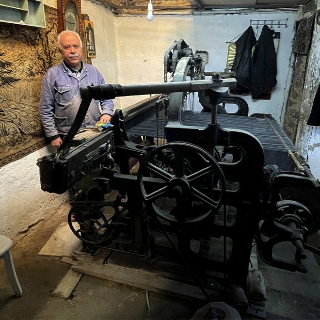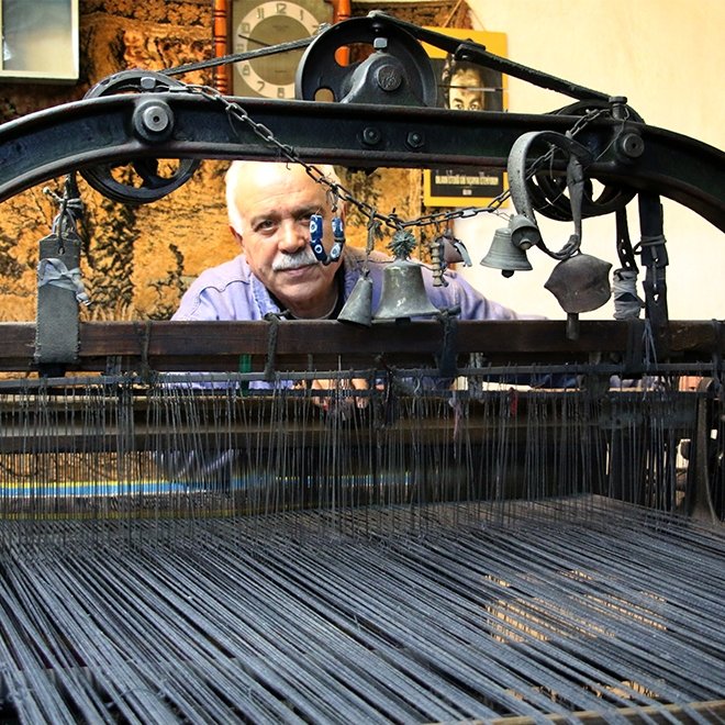"Dokuma yaptığım tezgah Alman malı 100 yıllık çok sağlam bir makine. Ben tezgahımdan çok memnunum. Dükkanıma hırsızlar girip makinenin bazı parçalarını çalmışlar. Yerine taktığım parçalar orijinal olmadığı için son 1 yıldır makineyi tam randımanla kullanamıyorum. Bu makine Türkiye'ye bir tekstil şirketi tarafından getirilmiş. Ben bu makinenin beşinci sahibiyim. Tezgahta çalışırken büyük keyif alıyorum. Bu makineye 'atar top' diyorlar. Bu makine kaşe, branda, yolluk, tiftik, battaniye dokuyabiliyor."