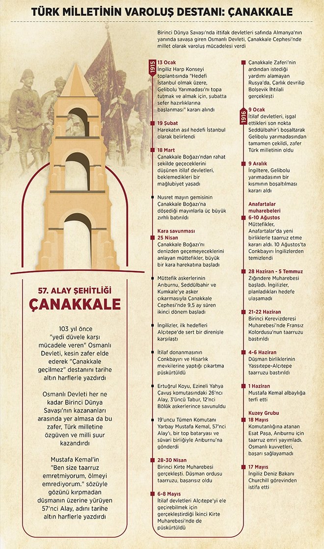 Birinci Dünya Savaşı'nda ittifak devletleri safında Almanya'nın yanında savaşa giren Osmanlı devleti, Çanakkale Cephesi'nde millet olarak varoluş mücadelesi verdi. 103 yıl önce "yedi düvele" karşı mücadele veren Osmanlı devleti, kara savaşlarında kesin zafer elde ederek "Çanakkale geçilmez" sözüyle tarihe altın harflerle destan yazdırdı.