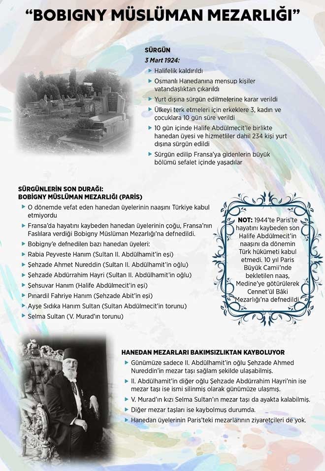 Osmanlı’nın 408 yıl boyunca sürdürdüğü hilafet makamı, 1924 yılında çıkarılan bir kanunla sonlandırılmıştı. Osmanlı hanedanının üyelerine ülkeyi terk etmeleri için kısa bir mühlet tanınmış; Halife Abdülmecid, ailesi ile birlikte daha o gece sınır dışına çıkarılmıştı. Birçok hanedan üyesi, Fransa’ya gitmeyi tercih etti ve ne yazık ki, naaşları dahi Türkiye’ye dönemedi. Bugün, Fransa hükümeti tarafından Faslılara hediye edilen Bobigny Müslüman Mezarlığı’nda, birçok hanedan üyesinin mezarı bulunuyor.