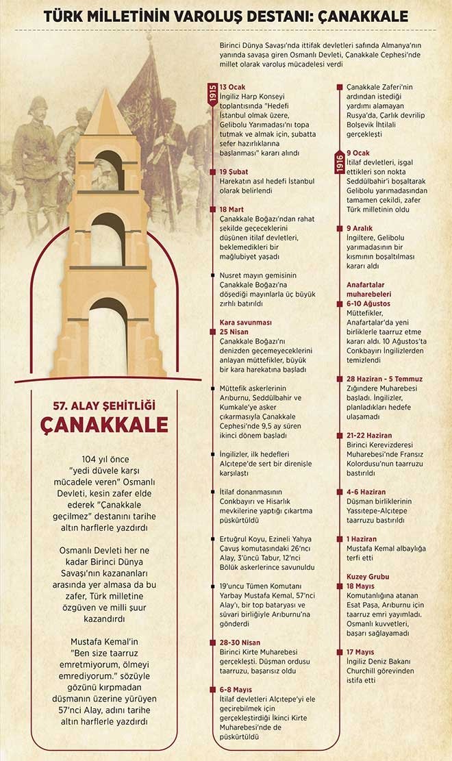 Birinci Dünya Savaşı'nda ittifak devletleri safında Almanya'nın yanında savaşa giren Osmanlı devleti, Çanakkale Cephesi'nde millet olarak varoluş mücadelesi verdi. 103 yıl önce "yedi düvele" karşı mücadele veren Osmanlı devleti, kara savaşlarında kesin zafer elde ederek "Çanakkale geçilmez" sözüyle tarihe altın harflerle destan yazdırdı.