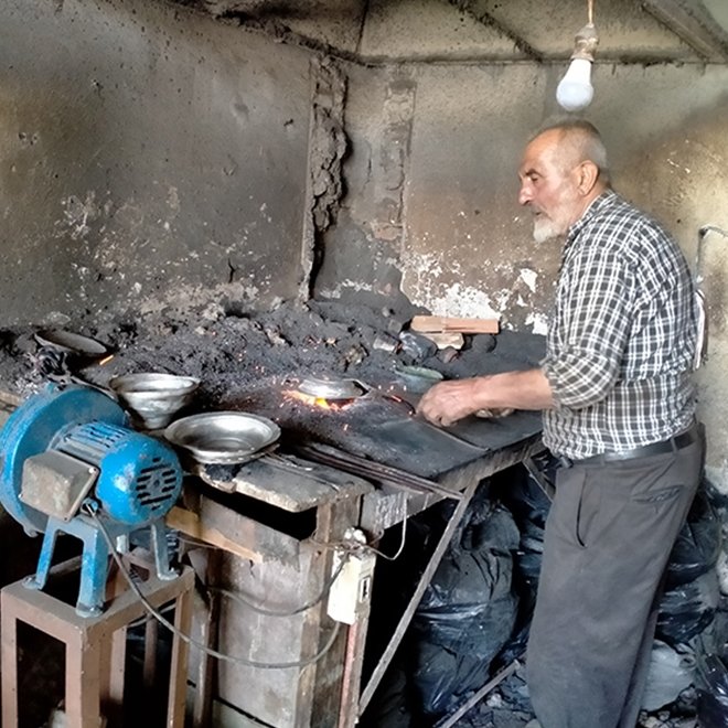 Çok sayıda usta yetiştiren Bilge, mesleğini tek başına az da olsa kendisine getirilen bakır eşyaları kalaylayarak sürdürüyor.