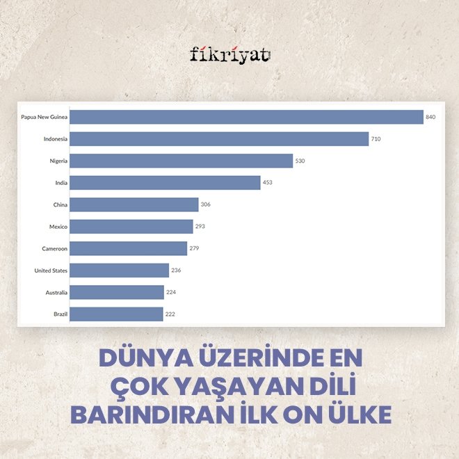 Varlık evimiz olarak adlandırabildiğimiz dilimiz, insanlığın tekamül ve geleceği için olmazsa olmaz bir vasıta. Our World in Data isimli kurum ülke ülke dünyada konuşulan dil sayısını araştırdı. Papua Yeni, Gine 840 dil ile zirvede yer alırken ilk on ülkenin son sırasında 222 dil ile Brezilya yer alıyor.