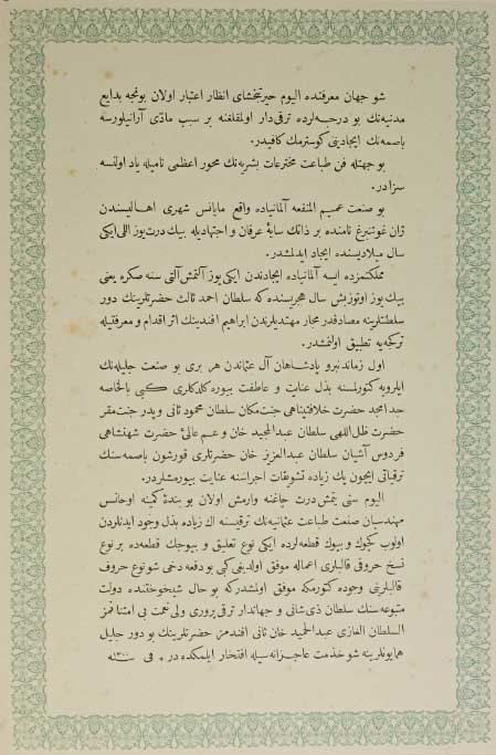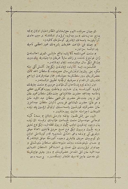 "Elyevm sinni yetmiş dört çağına varmış olan bu bende-i kemîne Ohannes Mühendisyan, san'at-i tabâat-i Osmaniyye'nin terakkîsine en ziyâde bezl-i vücûd edenlerden olub, küçük ve büyük kıt'alarda iki nevi' ta'lîk ve büyücek kıt'ada bir nevi' nesih hurûfu kalıbları îmâle muvaffak olduğu gibi, bu def'a dahî, şu nevi' hurûf kalıblarını vücûde getirmeğe muvaffak olmuşdur ki, bu hâl-i şeyhûhatinde devlet-i metbûasının Sultân-ı zişânı ve cihandâr-ı terakkî-perveri, velînîmet-i bî-imtinânımız, es-Sultânü'l-Gāzi Abdülhamîd Hân-ı Sâni Efendimiz Hazretleri'nin bu devr-i celîl-i hümâyunlarına şu hizmet-i âcizânesiyle iftihâr eylemekdedir. Fî sene 1300"